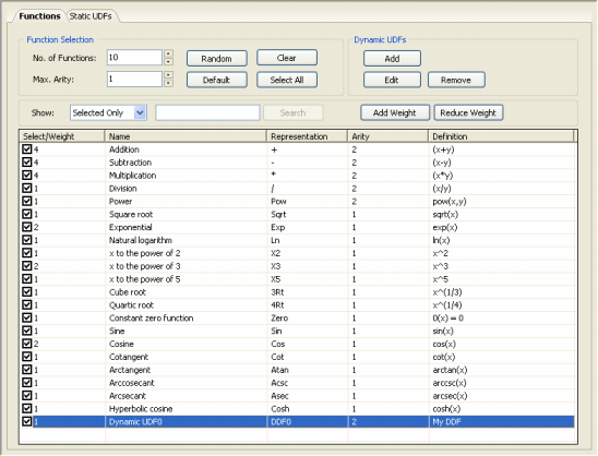 To select a function, just check the box on the left. By default, the weight of each function is 1, but you can increase the probability of a function being included in your models by increasing its weight in the Select/Weight column. GeneXproTools automatically balances your