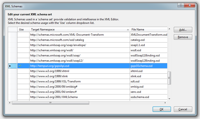 Then press the add button, navigate to the folder c:\Program Files\GeneXproServer 50\schemas\ and select the file gxps5Schema.xsd.