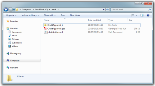 This job file will use the CreditApproval.gep file which is in the folder c:\work as template. It will process in parallel (async='yes') two runs, one for 30 minutes and the second one for 45 minutes. Each one of the runs will be a copy of the original CreditApproval.gep file and will be placed in one of two sub-folders named CreditApproval_1 and CreditApproval_2. By default GeneXproServer will generate a report for each new run that includes logging and summary information.