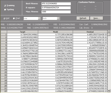 Under this heading is shown the output of the model (Model) for all the records on the current data set. In case of calculation errors, a red strip and the identifier ERROR is shown.