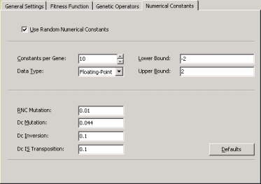 Check this box if you want to use the GEP-RNC learning algorithm of GeneXproTools. This algorithm has a facility for handling random numerical constants and it evolves models with them.