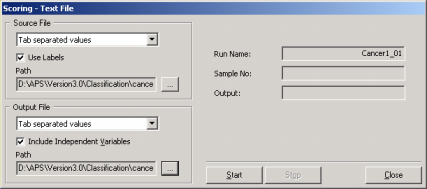 In the Source File Frame you enter all the information concerning the source file. In the combo box you must choose the separator used in the source file. Then, if the independent variables in your scoring data are identified by a name, you must check the Use Labels box. And finally, in the Source File Browser you must click the button in the right to choose the Path for the source file.