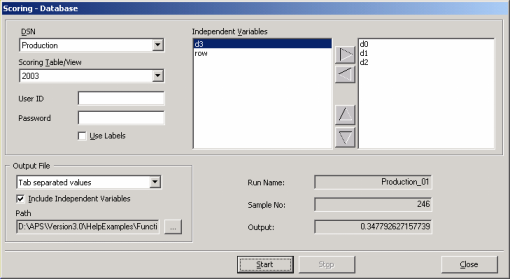 Lists all the columns of the selected Table or View. To use a column for scoring, select it and press the top arrow button. To remove one column from the selected columns (in the rightmost list) press the second button from the top. The two bottom buttons can be used to change the order of the columns selected for scoring.